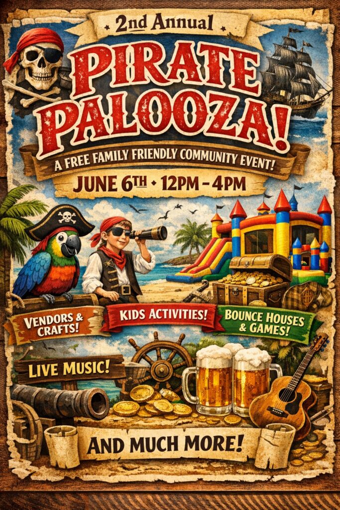 For the adult visitors of the second annual Pirate-Palooza, a beer and wine garden will be onsite, as well as dozens of vendors. For the kids, bounce houses, games, activities, and live music will be featured, and, of course, pirates! This event is free for the community.