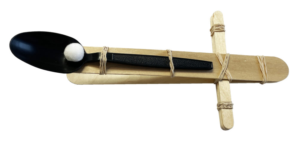 STEP 5: Place a cotton ball or pompom on spoon (F). Hold catapult in place with one hand on the small craft sticks. Push down on spoon (G) with a finger on your other hand and remove quickly to launch your “snowball.”