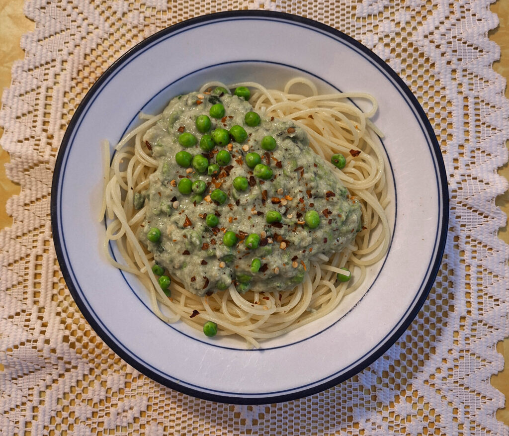 6. Serve over pasta, chicken, or fish and garnish with the reserved peas and onions and a sprinkling of lemon zest.