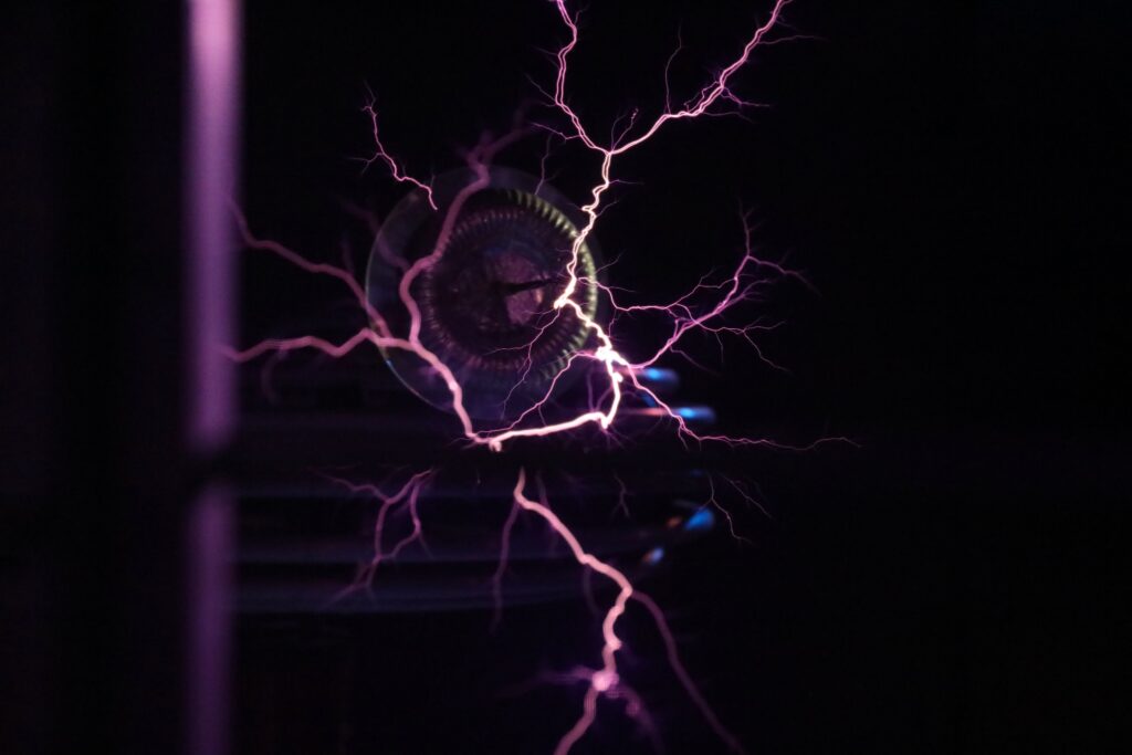 Tesla coils are a bit like lightning machines. They take electricity—like what powers your house—and push more force behind it. A lot more force!. When the electricity has more force, it can jump through the air in bright, glowing sparks that look like tiny lightning bolts. This is exactly what you can expect to see from RMSC’s two six-foot-tall Tesla coils at its Electricity Theater.