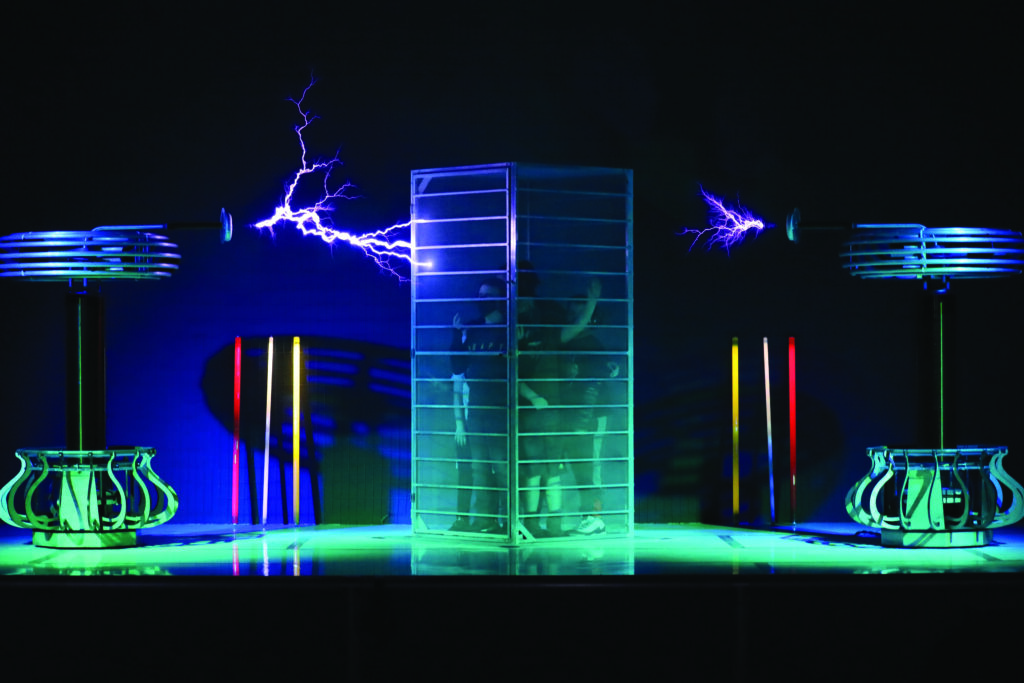 In Electricity Theater, this same idea is used to make music. By changing how many times per second the lightning strikes, the frequency of the sound waves changes. This allows the thunder to be “tuned,” so the Tesla coils can actually play songs. In fact, they are programmed to perform more than 400 different songs!