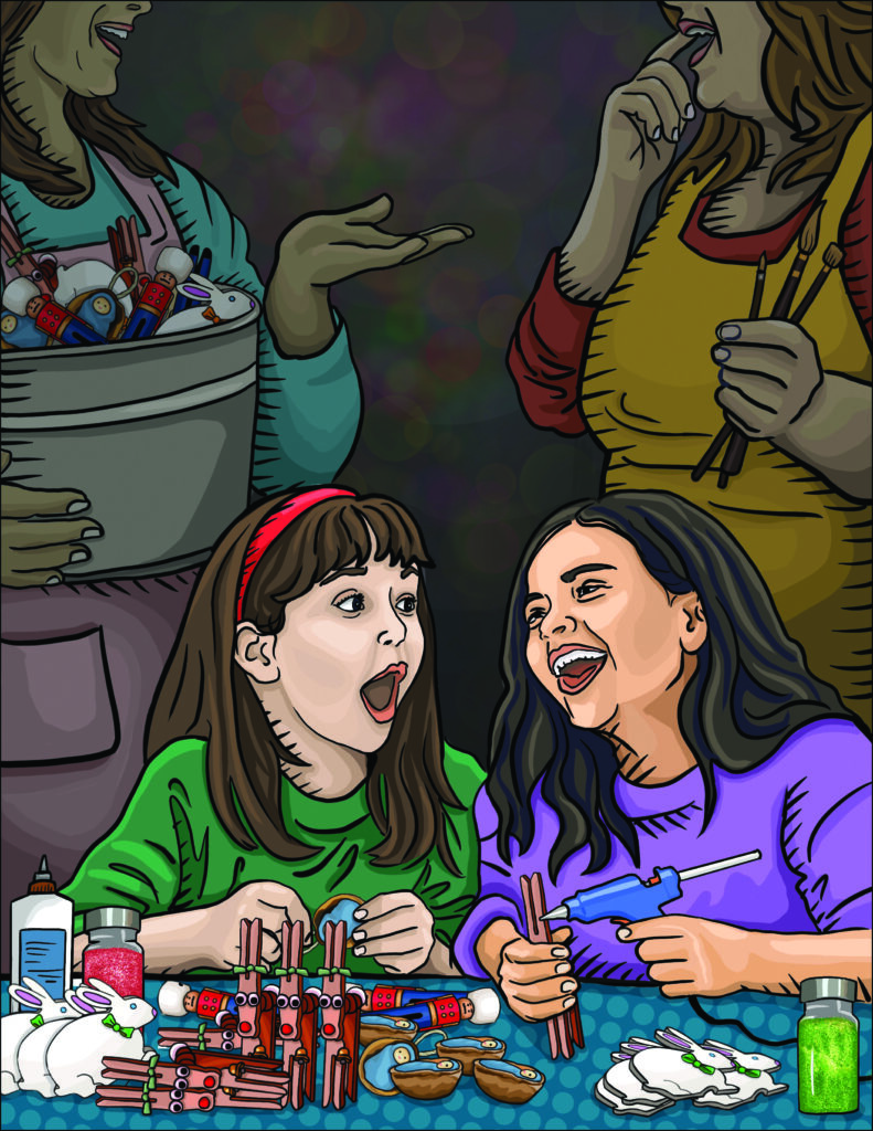 During craft prep, there was a job for everybody, no matter how young. The little kids got sandpaper duty, as their brains were not sophisticated enough to protest the drudgery that lay ahead. The bigger kids did light painting and gluing; adults did basic sewing. Pol Pot and Mao Zedong (née Mom and Aunt Terre) split duties on the band saw, cutting thirty wooden animals at a time. Terre was so exacting and precise that she was the only one trusted to paint eyeballs. It was just one of the tedious jobs normally assigned to torture prisoners in Attica that she accepted happily.