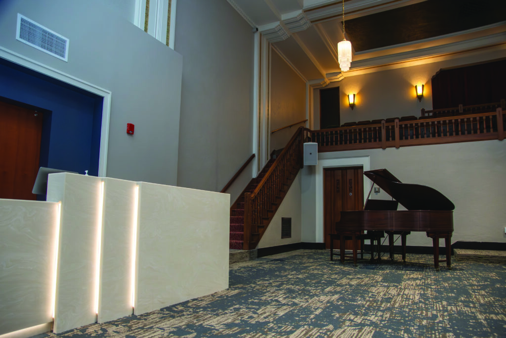 Subsequent phases included the second-floor lounge and its restrooms, the vestibule and corridor at the west entrance, and the transformation of the Floreano Room, now more welcoming for gatherings and events. Current work at the front of the building includes new stairs and railings and a repositioned retaining wall along East Main Street.